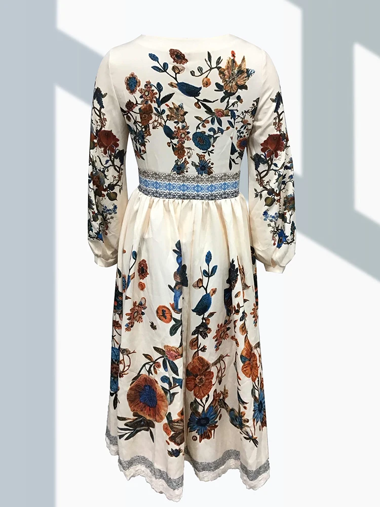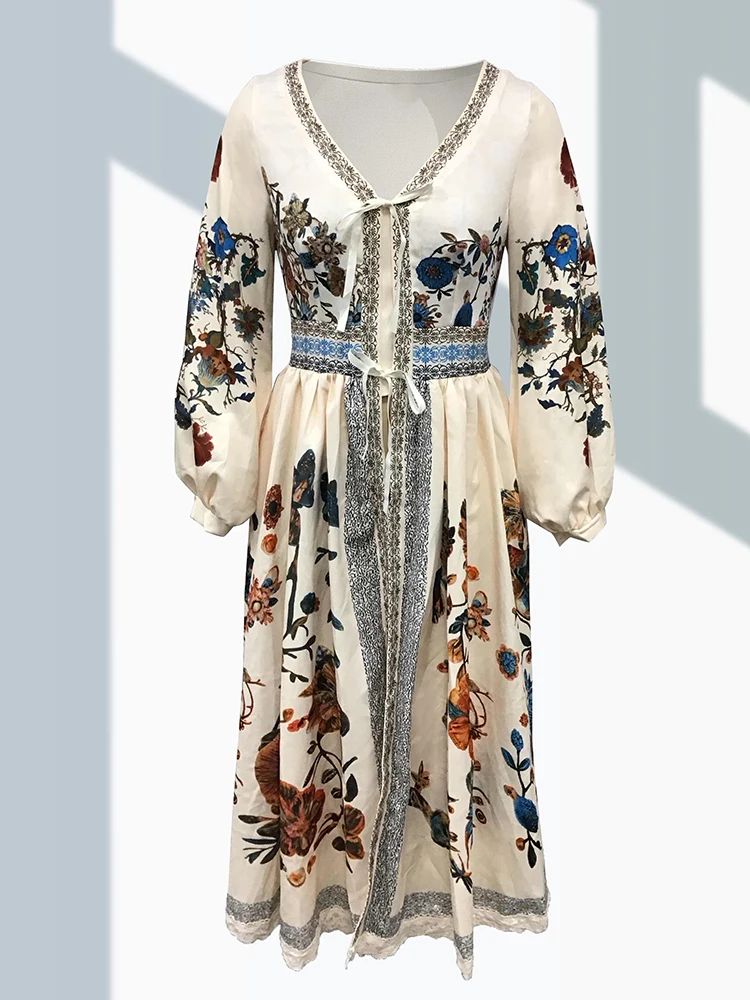 Luxury Elegant Lace Patchwork Boho Women’s Long Dress Flower Plants Pattern V Neck Lantern Sleeve Woman’s Long Dress for Spring
