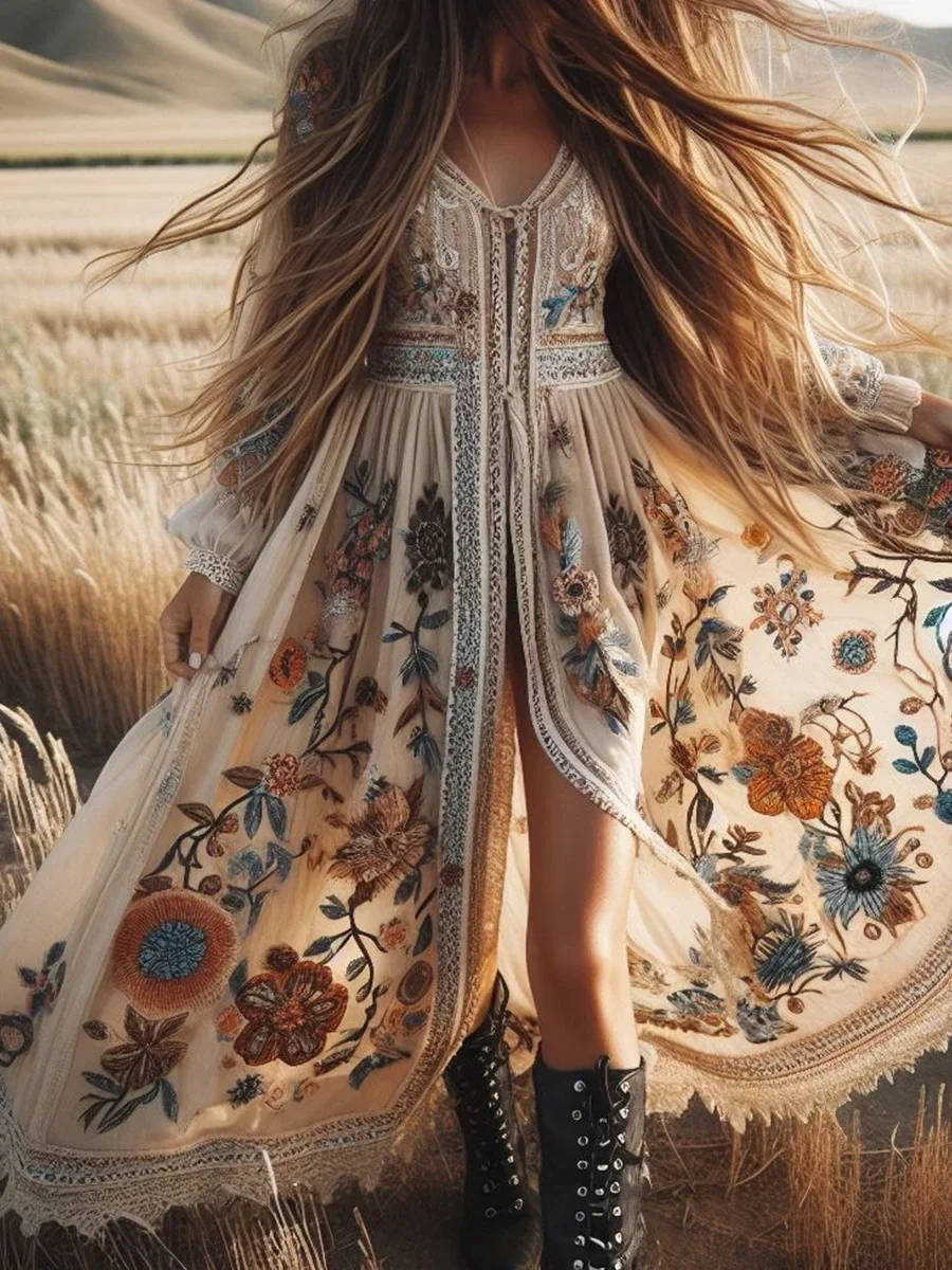 Elegant Boho Lace Patchwork Long Dress – Floral V-Neck Lantern Sleeve